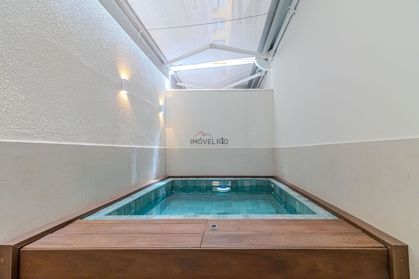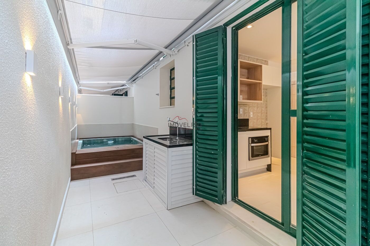 Apartamento garden com piscina com hidromassagem e cromoterapia, toldo elétrico com proteção solar para maior privacidade, deck em madeira ecológica, bancada gourmet e armários; composto por: